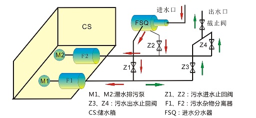 1、污水進入分水器FSQ,由分水器FSQ分配后進入-止回閥Z1、Z2-雜物分離器F1、F2,污水中的雜物在雜物分離器中過濾分離暫存在F1、F2內(nèi),被過濾后的污水進入儲水箱CS內(nèi);